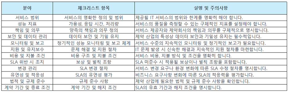 • IT 분야의 기술 발전과 트렌드 변화에 따라 SLA가 적절히 업데이트되고 조정될 수 있는지 검토합니다.